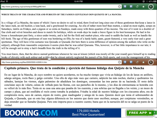Would you like to read Don Quixote in Spanish and English at the same time on your iPad? I wanted to try it, and here are the steps that worked for me: