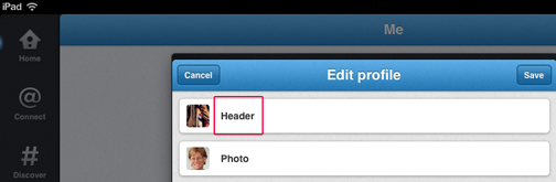These are the steps I followed to upload the header from within the Twitter program on my iPad. The steps are similar but a bit different if you are at your desktop. Just remember to look for the header photo upload choice in your profile area. The photos below also reflect the steps I used.