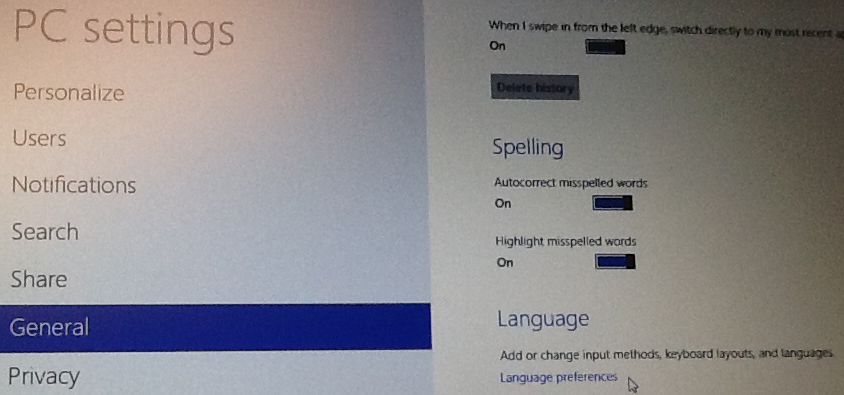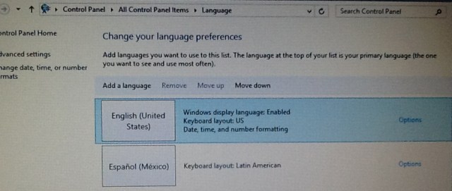 In Windows 8, it is easy to add a language pack to the control panel so that you can quickly switch between English and another language. You can change keyboard settings in the same area. I tried this out on a Lenovo laptop with Windows 8 that I just installed yesterday. I used my iPad to snap some shots of the Lenovo screen which is why the photos are not so great, but I thought I would include them anyway.