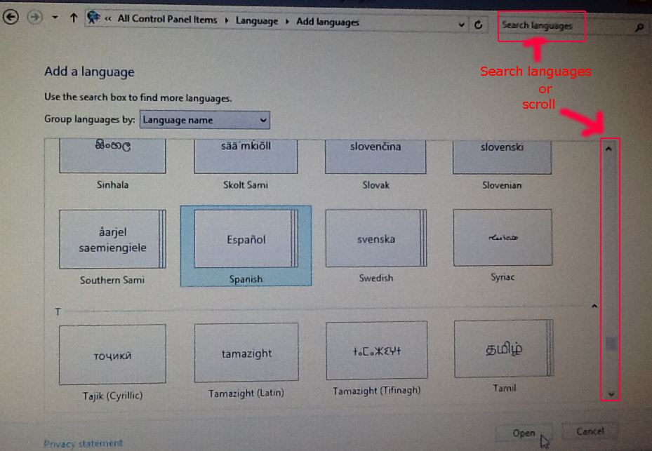 - scroll down to the language you want to add, or type the name of the language in the Search box