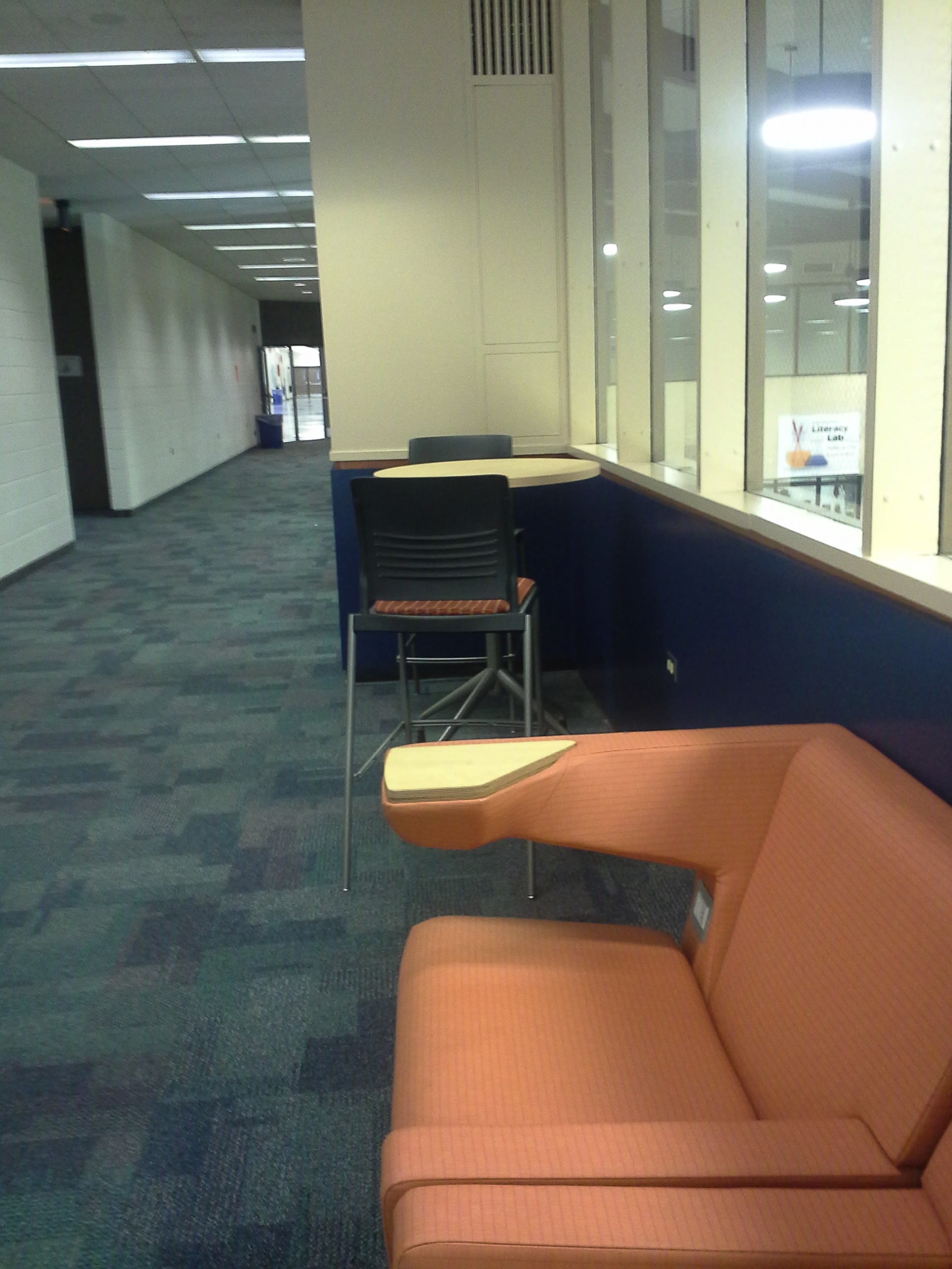 This hallway at Buffalo High School has couches with plug inserts for devices, and tall tables with chairs.